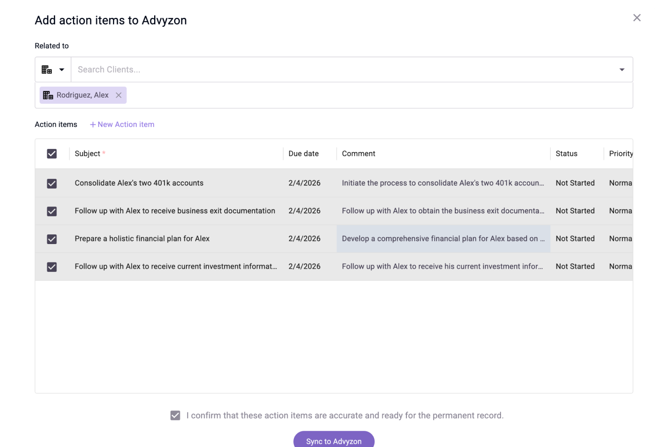 Every sync requires your explicit approval. You review all notes, tasks, and field updates before they enter Advyzon. That means your CRM stays accurate and up to date.