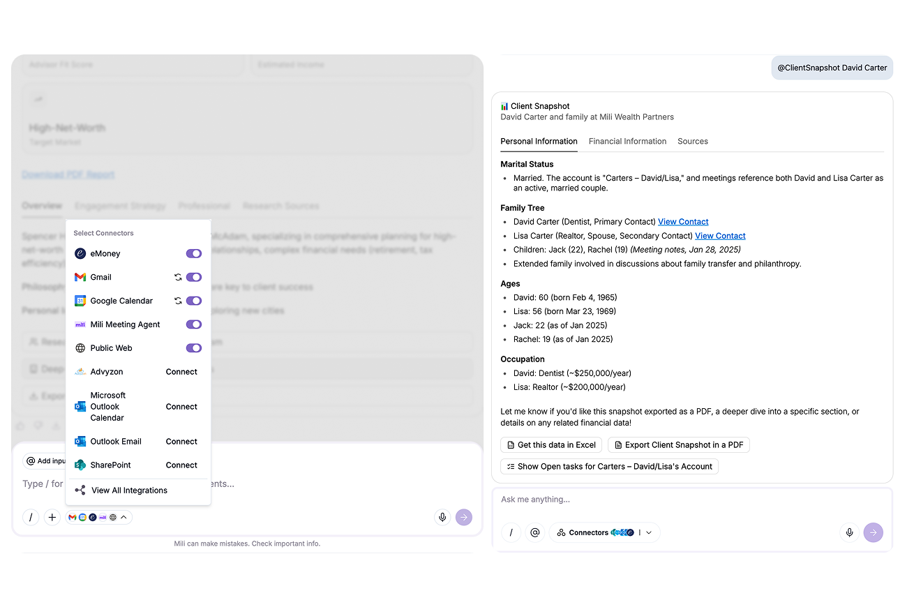 The integration matches your exact Advyzon user permissions. If you can see it in Advyzon, you can access it through Mili. Your existing security model stays intact.
