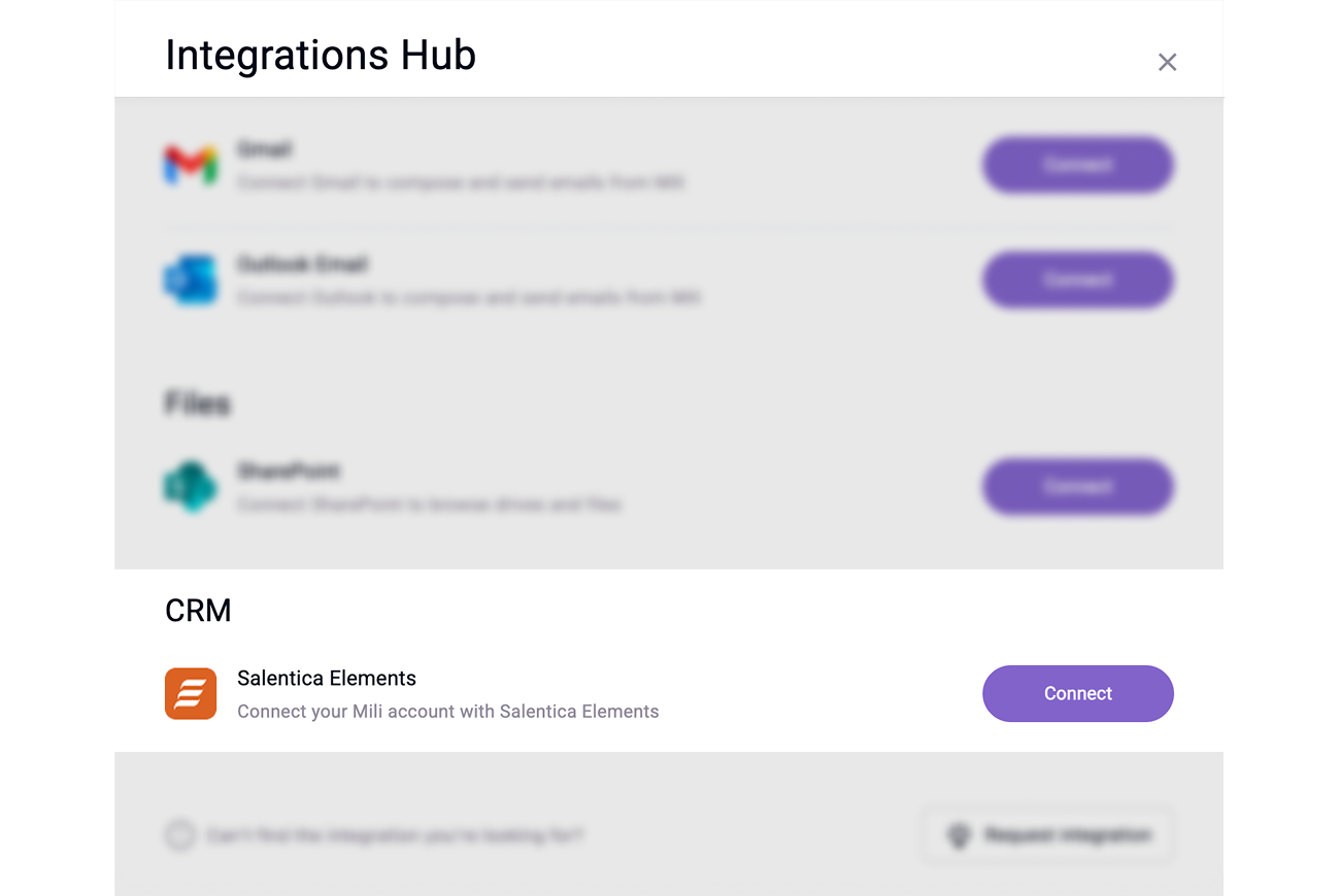 At Mili, we believe in intentional data access. The integration only pulls Salentica Elements data when you trigger specific actions - preparing meetings, syncing notes, or making queries. Mili does not access or store client data in the background beyond regular contact syncs.