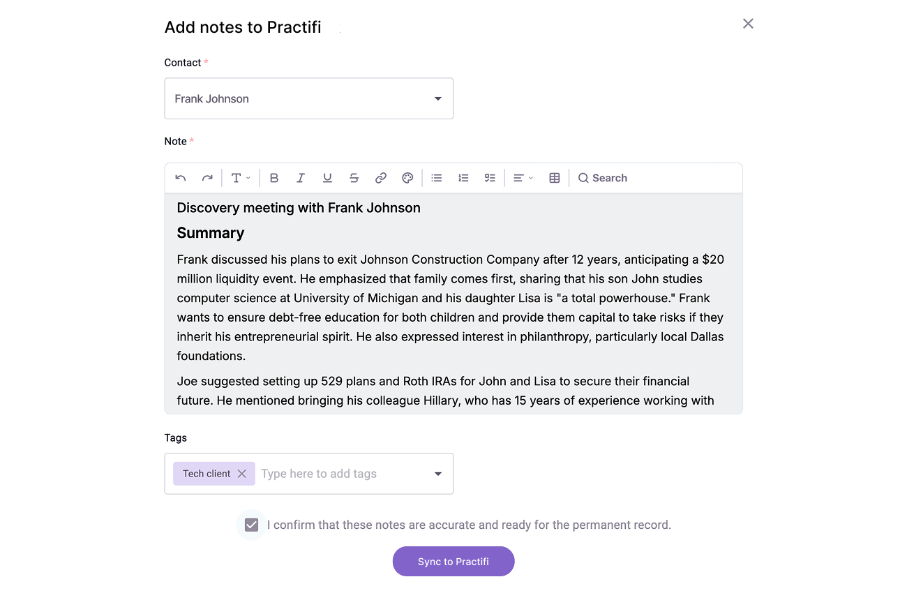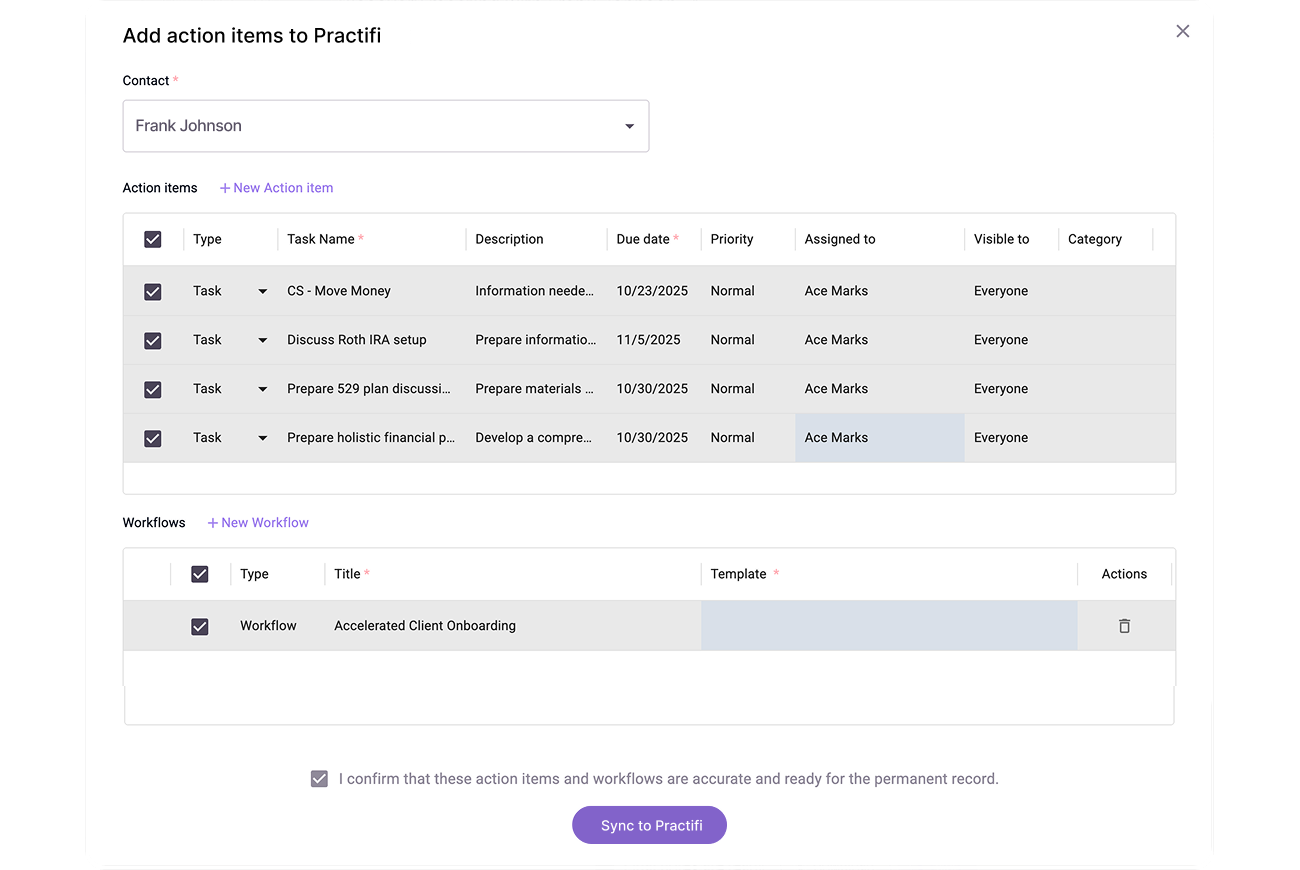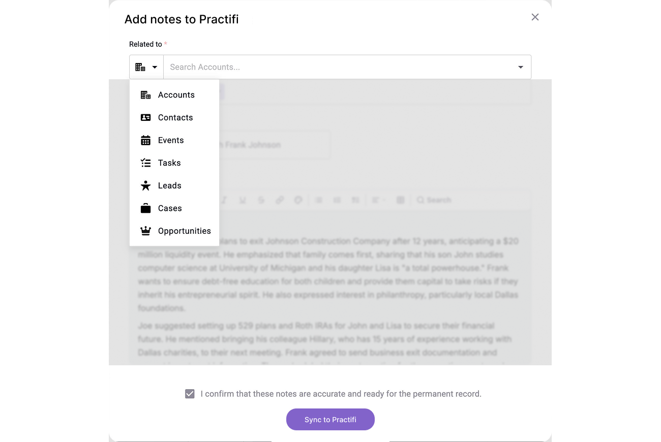 Every sync requires your explicit approval. You review all notes and tasks before they enter Practifi. That means your CRM stays accurate and up to date.