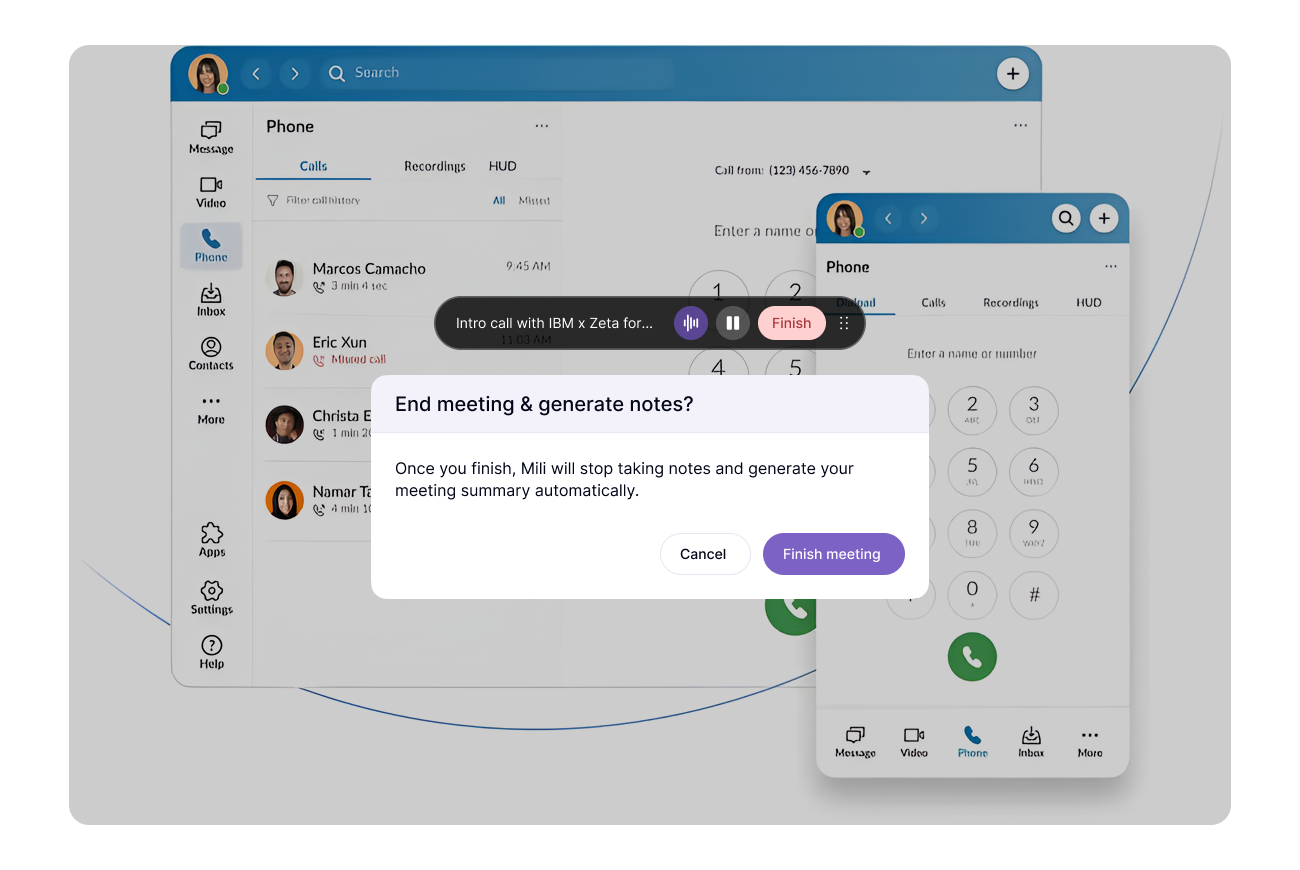 No. Mili never connects to RingCentral. No plugin, no API, no permissions to grant. Mili runs on your device (desktop, laptop) and listens through the microphone and speaker, the same ones already carrying your conversation. Think of it like having a brilliant assistant sitting at your desk during a speakerphone call, taking notes from what they hear. Your client doesn't know they're there.