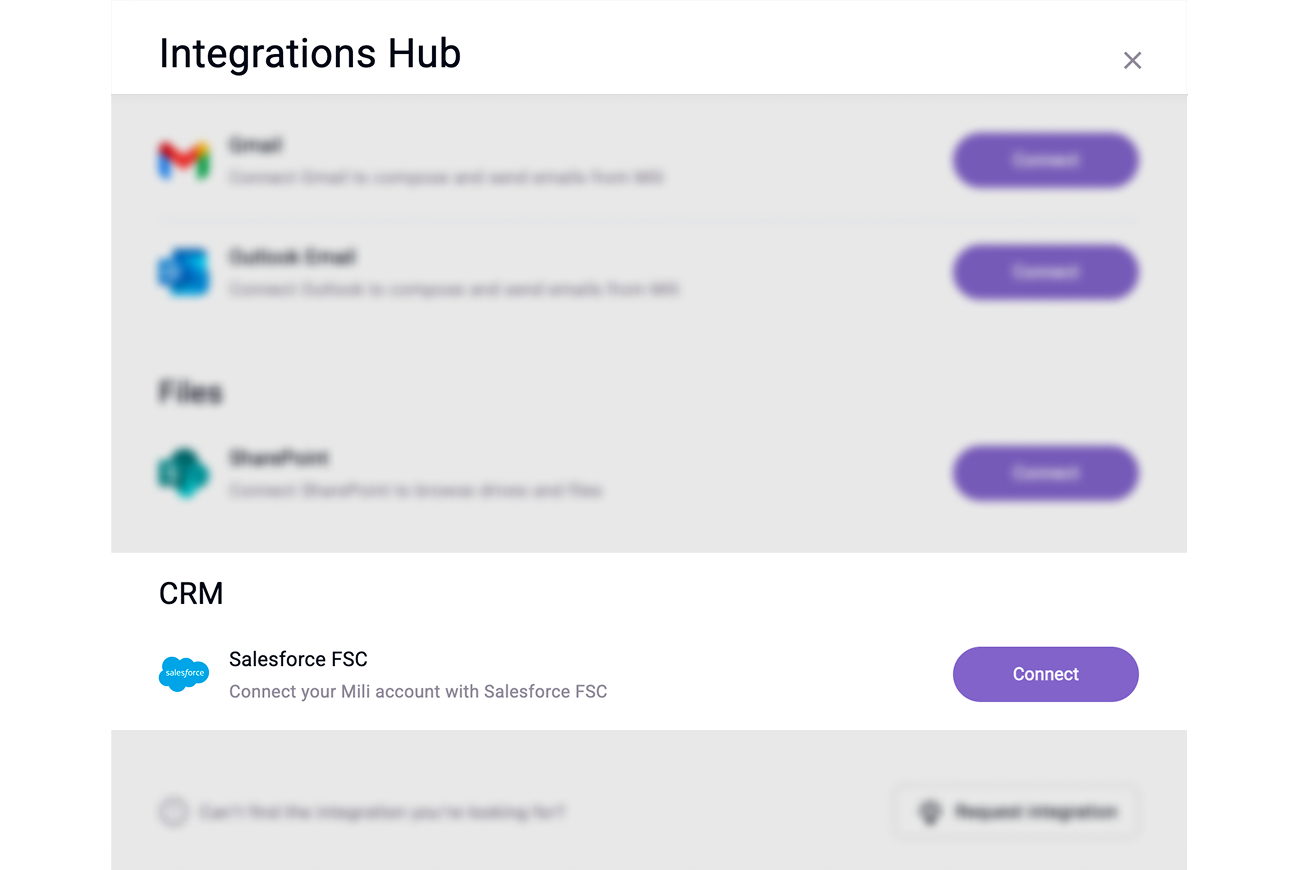 At Mili, we believe in intentional data access. The integration only pulls Salesforce Financial Services Cloud data when you trigger specific actions - preparing meetings, syncing notes, or making queries. Mili does not access or store client data in the background beyond regular contact syncs.