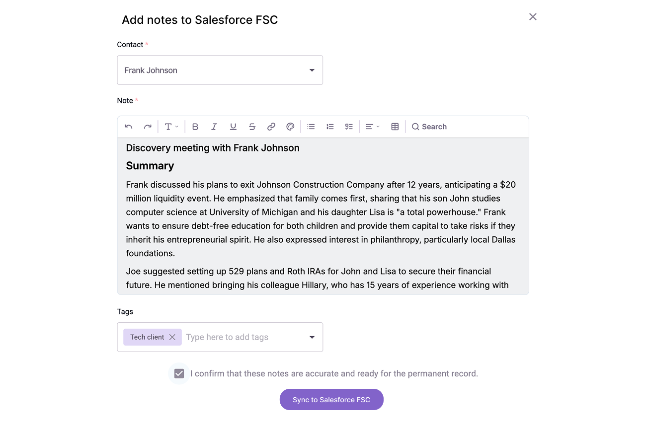 Every sync requires your explicit approval. You review all notes and tasks before they enter Salesforce Financial Services Cloud. That means your CRM stays accurate and up to date.