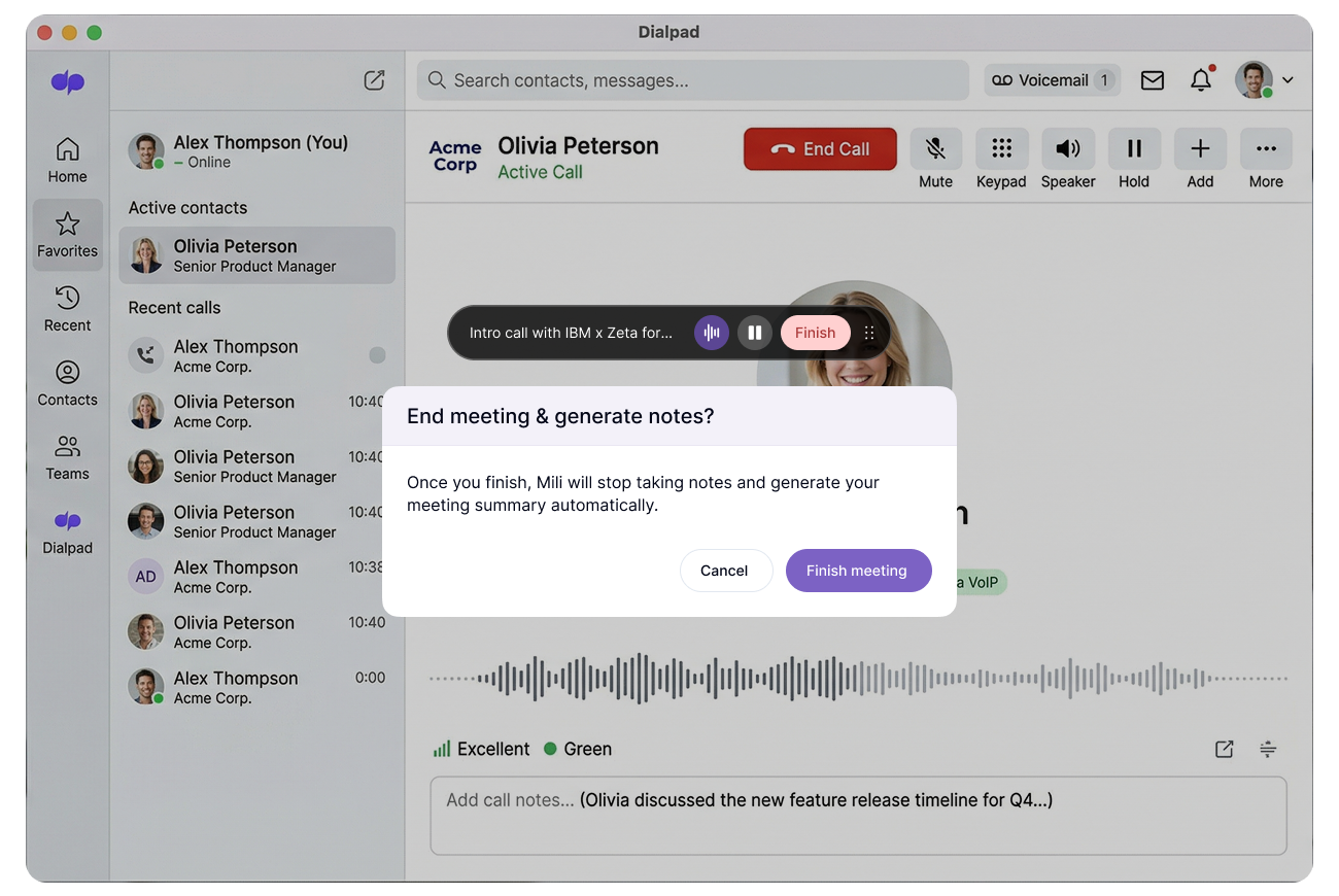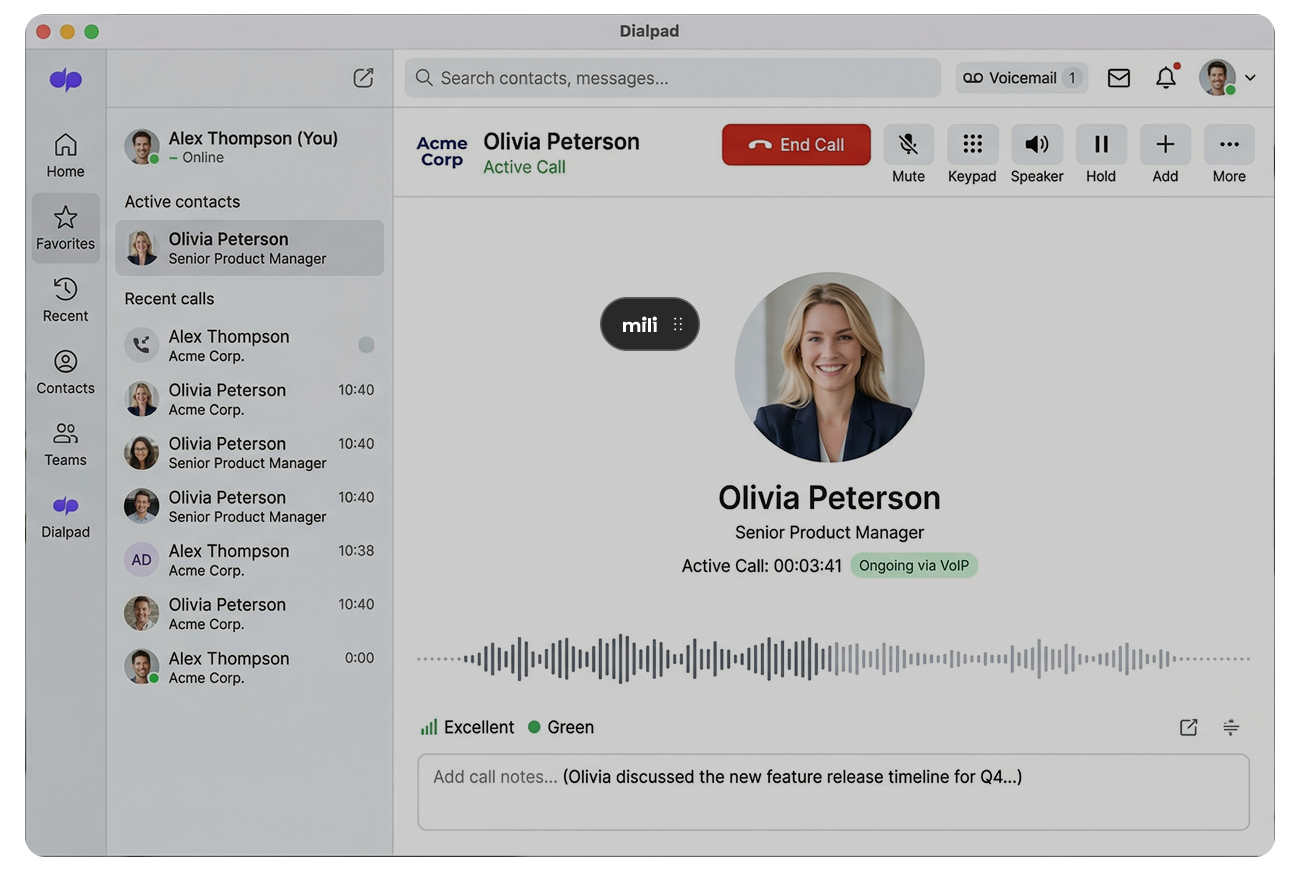 No. Mili never connects to Dialpad. No plugin, no API, no permissions to grant. Mili runs on your device and listens through the microphone and speaker, the same ones already carrying your conversation. Think of it like having a brilliant assistant sitting at your desk during a speakerphone call, taking notes from what they hear.