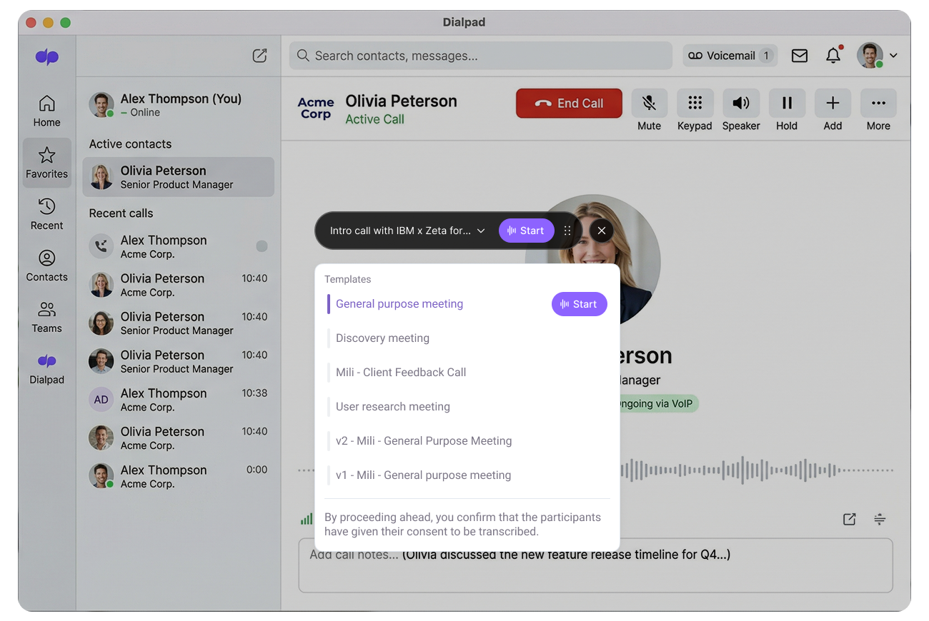 No. Mili doesn't record through Dialpad, or at all. It listens through your device and converts audio to structured notes in real time. The audio is processed instantly. No recording is ever created, stored, or saved.