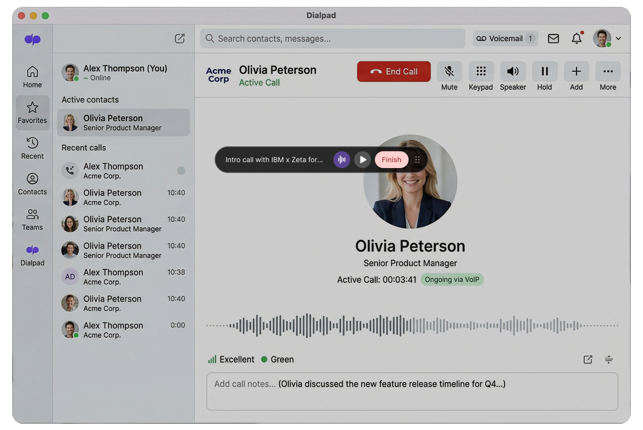 Nothing changes on Mili's end. Because Mili listens through your device, not through Dialpad's system, it works the same way whether you're on Dialpad, RingCentral, Five9, Vonage, 8x8, or Google Voice. If you switch platforms tomorrow, Mili still works exactly the same.