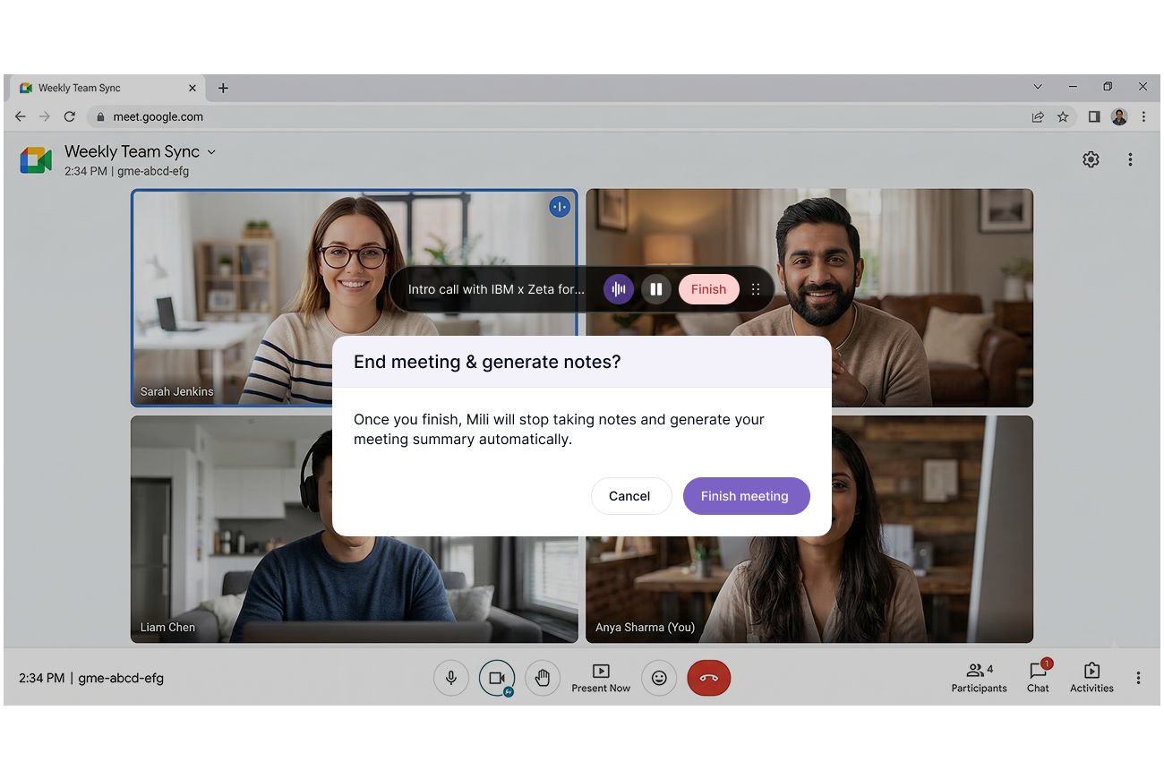 Nothing changes on Mili's end. Because Mili listens through your device, not through Google Meet's system it works the same way whether you're on Meet, Zoom, Microsoft Teams, Webex, or even a regular phone call.