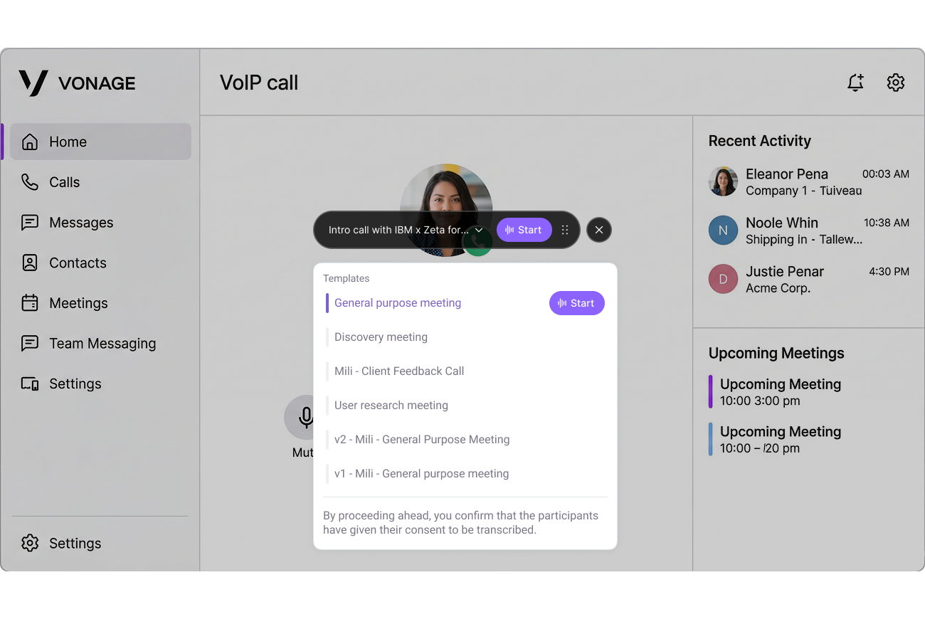 No. Mili doesn't record through Vonage, or at all. It listens through your device and converts audio to structured notes in real time. The audio is processed instantly. No recording is ever created, stored, or saved.