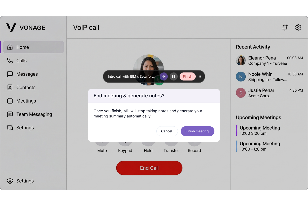 No. Mili never connects to Vonage. No plugin, no API, no permissions to grant. Mili runs on your device and listens through the microphone and speaker, the same ones already carrying your conversation. Think of it like having a brilliant assistant sitting at your desk during a speakerphone call, taking notes from what they hear.